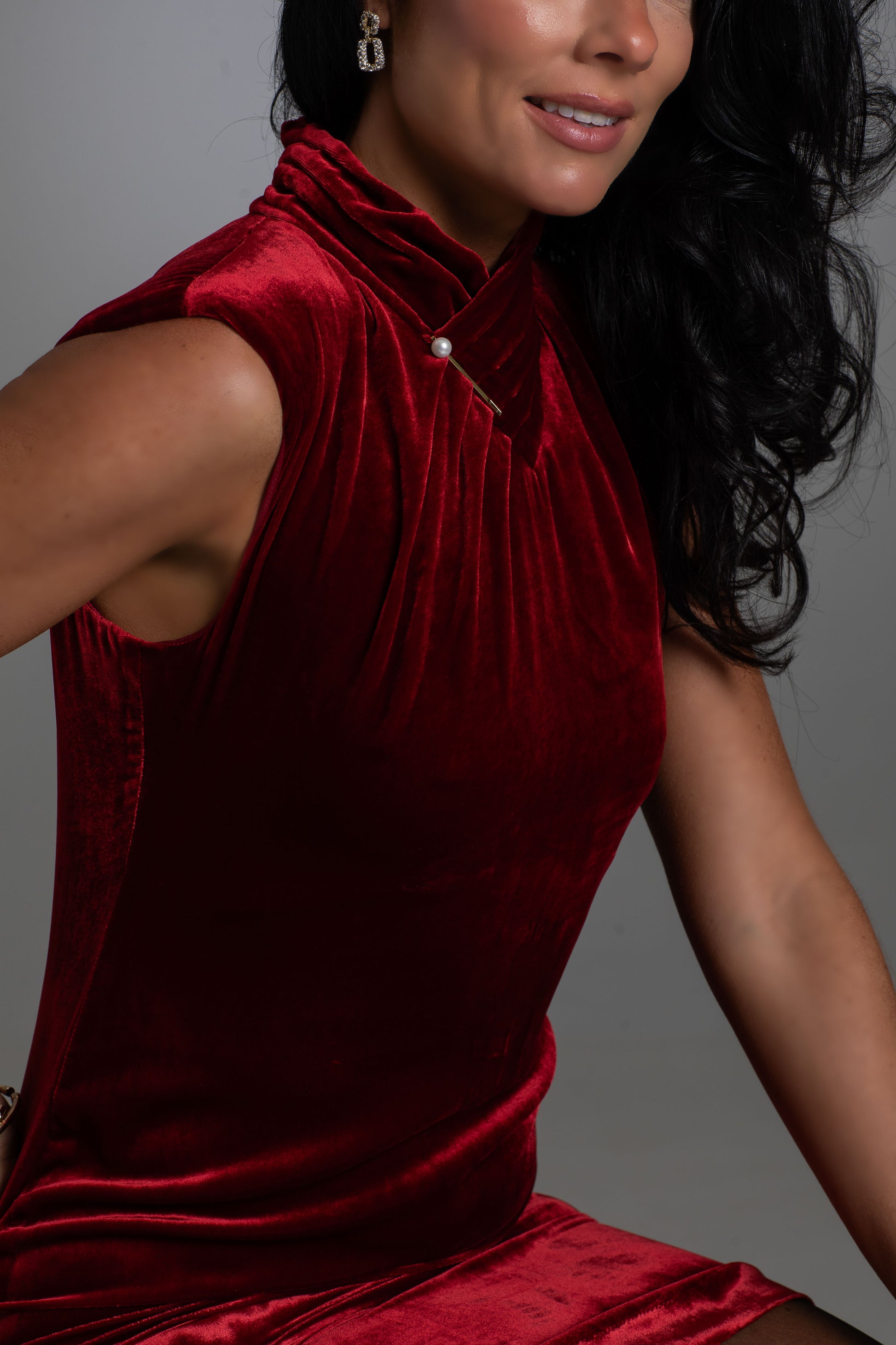 Tailored in luxurious silk velvet, this dress drapes the body with natural grace. The sculpted silhouette highlights feminine lines, while the softly gathered neckline, adorned with a delicate jewel with a subtle pearl accent, evokes timeless sophistication.